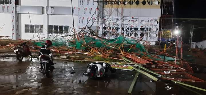 MUBA,TRCNEWS.ID – Diduga akibat hujan disertai angin kencang tiang penahan bangunan RSUD Sekayu yang saat ini tengah dialakukan pembangunan, roboh hingga menimpah kendaraan yang parkir tak jauh dari bangunan gedung tersebut.