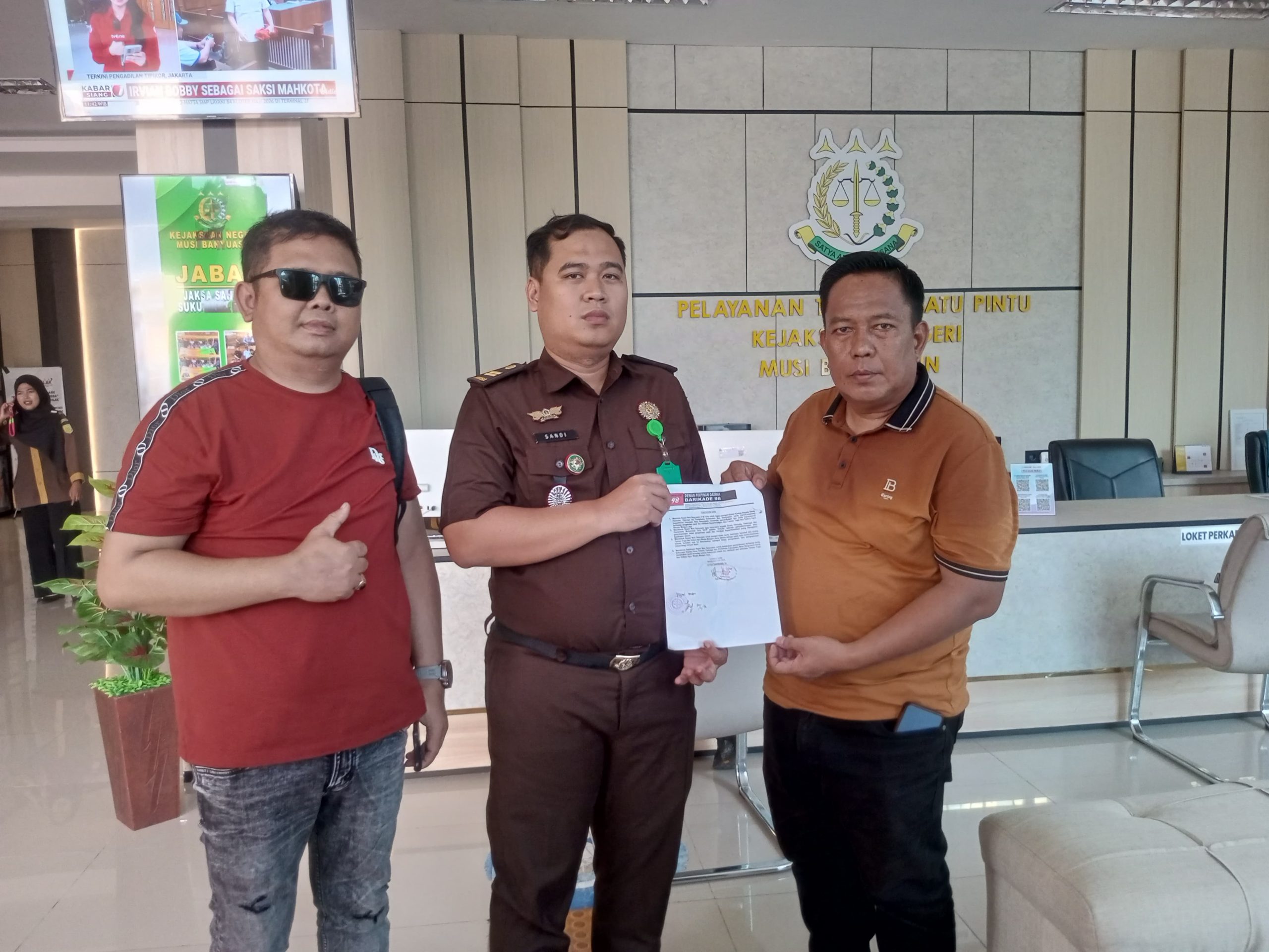 Dalam kesempatan itu, Barikade 98 Muba juga secara resmi menyerahkan laporan kepada Kejaksaan Negeri Musi Banyuasin untuk ditindaklanjuti sesuai hukum yang berlaku.